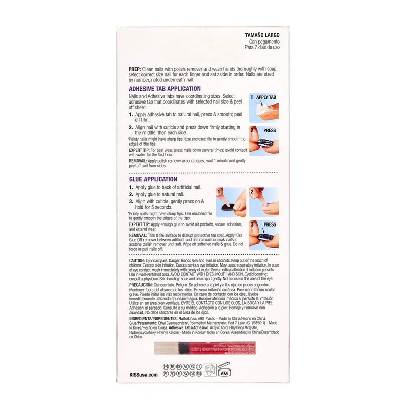 - Stick with KISS: Our press-on nails and glue-on nails take minutes to apply, and they stay on for up to a week; Fake nails fit perfectly over your own nails with no mess or fuss; Glue-on nails work best with KISS PowerFlex Nail Glue, sold separately