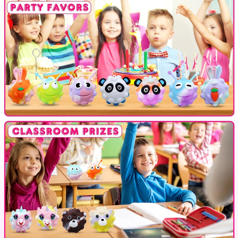 - 🎁【NEVER GO WRONG AS A GIFT】The animal mini pop balls fidget keychain toys are great for party toys, pinata stuffers, birthday gifts, goodie bag stuffers, treasure box toys for classroom, classroom rewards and prizes for students, Prizes for kids, office Desk toys carnival prizes, Stocking stuffer. Easter basket stuffers for Kids,Ideal pop fidgets Party Favors for kids.