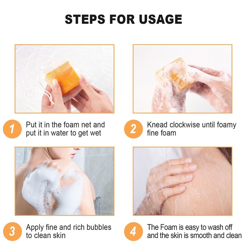 - Turmeric soap for face and body:Perfect for daily use!Step 1:Wet your skin with warm water and apply turmeric soap evenly on your skin;Step 2:Massage for 20-30 seconds and finally rinse off with water