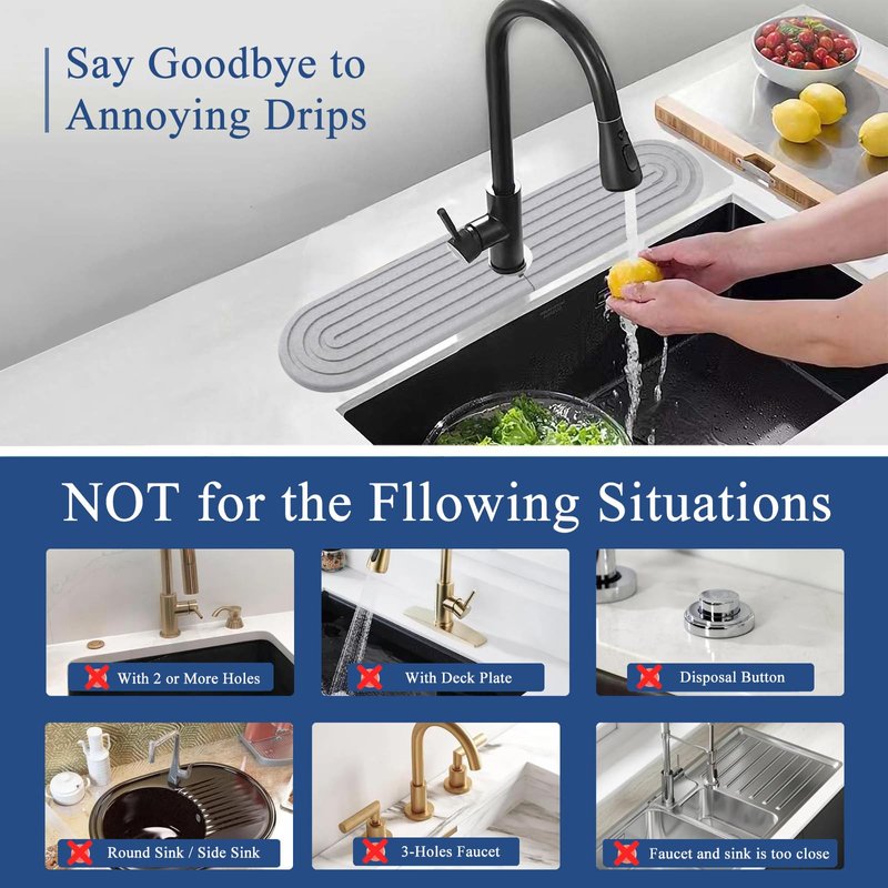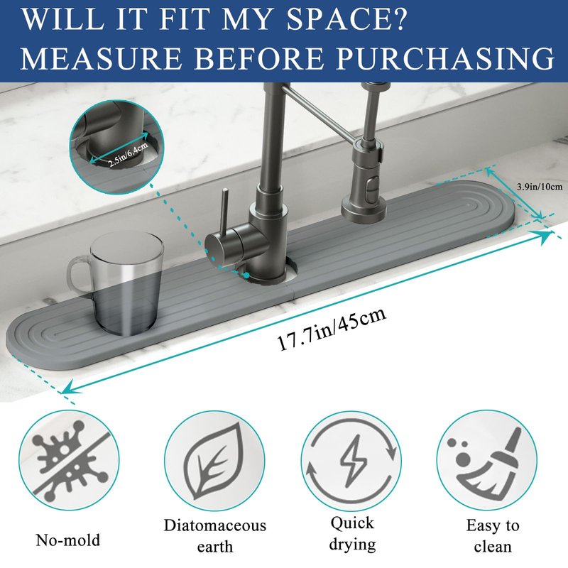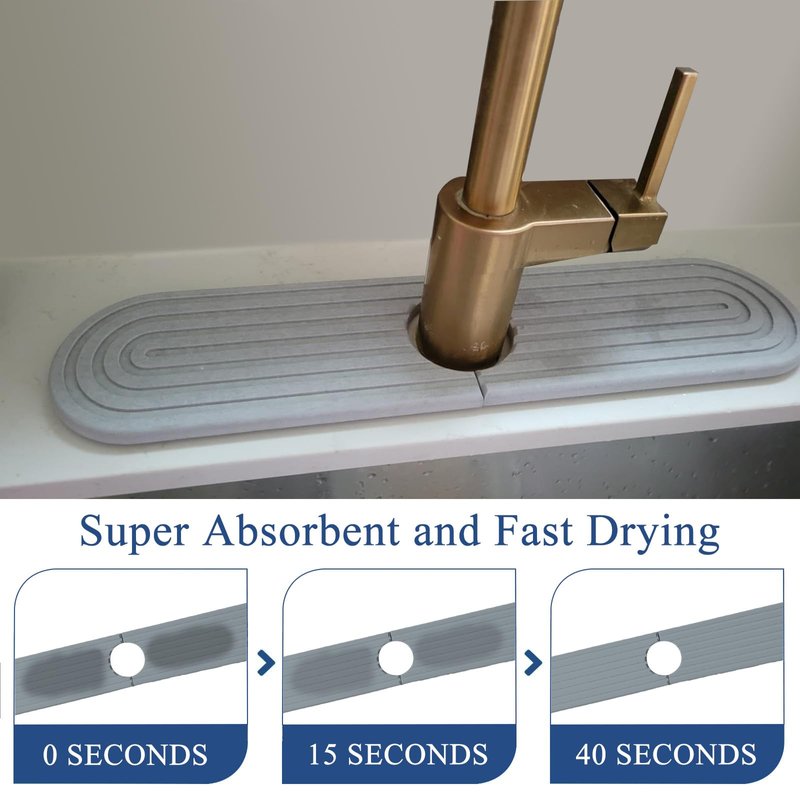 - Super Absorbent: This kitchen sink faucet mat splash guard is made of natural diatomaceous earth, its small holes enable amazing water absorption, quickly soaking up splashes and evaporates moisture within minutes which can keep your countertops dry and tidy