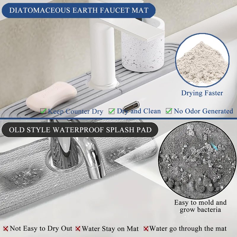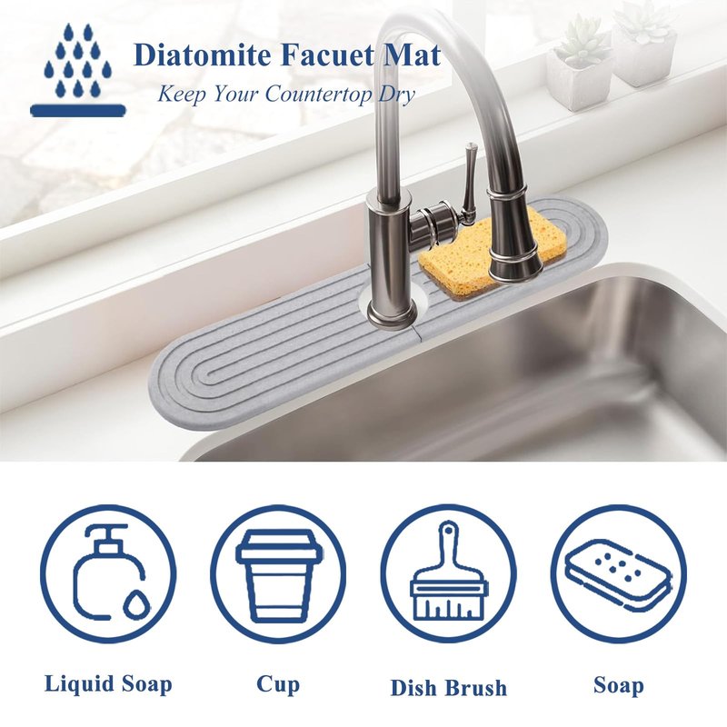 - Multi-Purpose Sink Organizer & Storage: This diatomte Faucet mat for kitchen Sink Splash Guard is not only a drying mat, but also a sink organizer for toothbrush, sponges, dish brushes, cup and hand soap. Keep your kitchen space neat and organized
