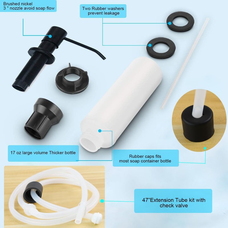 - ☞ TWO WAYS OF USING - Kitchen soap dispenser comeS with 17 oz large volume soap bottle and 47" extended tube kit. Sink soap dispenser with 41" extension tube let u don't have to refill the soap frequently any more, put extension tube directly into big soap bottle u bought. This soap dispenser is suitable for all liquid soap,such as lotion, Body Wash, softsoap ,hand soap, dish soap.