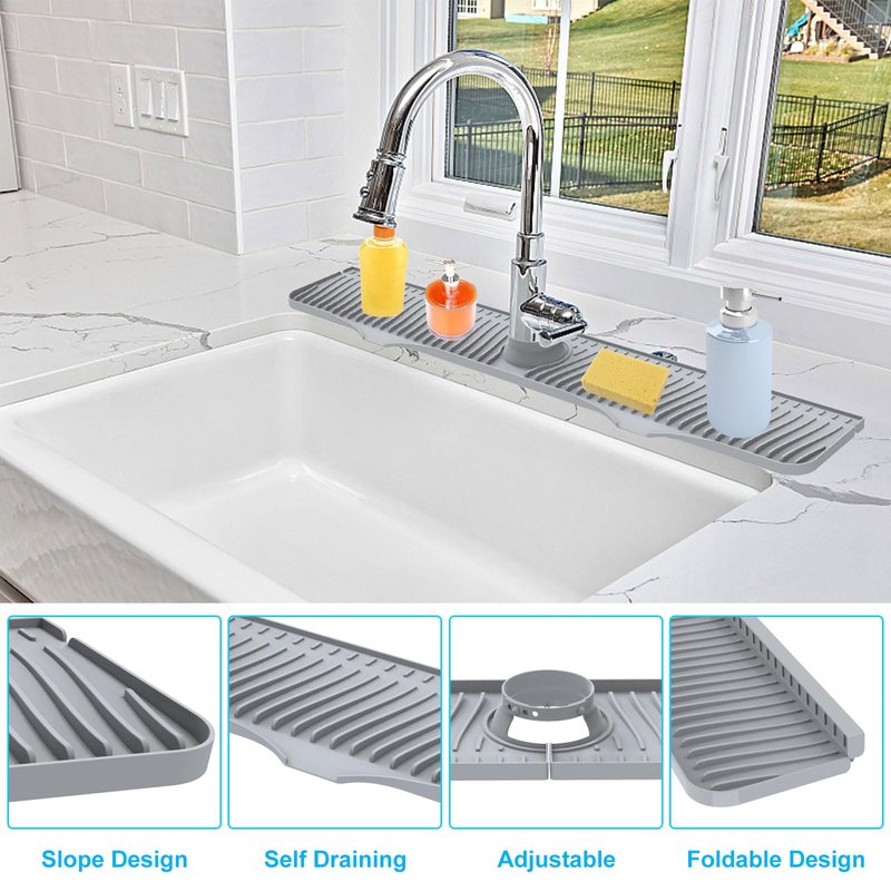 - 【Multifunction Mat】Our kitchen sink mat is not only a faucet drying mat, it also a sponge holder for kitchen sink, dish soap tray, dish drying mat, coffee mat, toothbrush tray. It will be a great assistant in your life! You could install this silicone sink mat almost anywhere, like faucet, kitchen, bathroom sink, laundry tub, rv, farmhouse and etc.