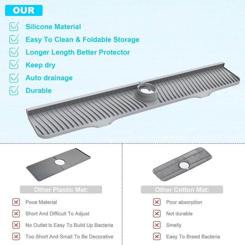 - 【Easy to Clean and Storage】Different from the traditional textile materials faucet pad, our silicone splash faucet mat of 30 inches can be used repeatedly and are easier to clean than cotton materials. When you are not using it, it can be folded and stored without taking up space, which is easy to store and carry.