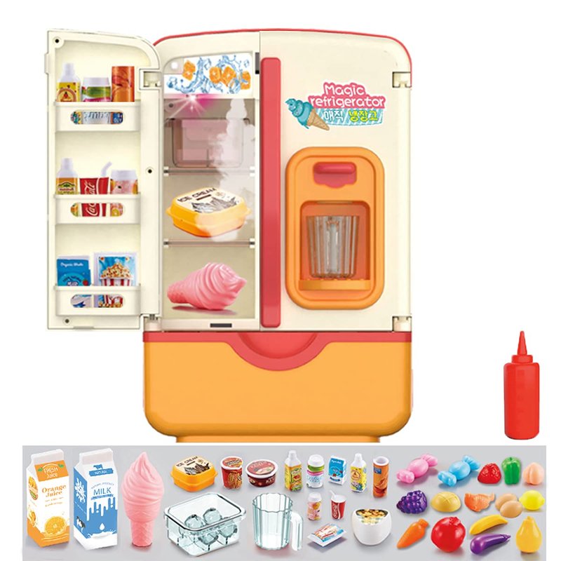 Children's refrigerator toy set with realistic lighting and spray effects and music, suitable for infants and children's kitchen toy set, complete with simulated food, materials