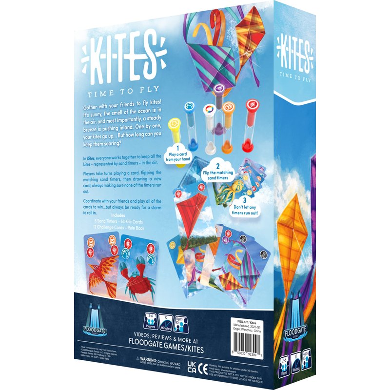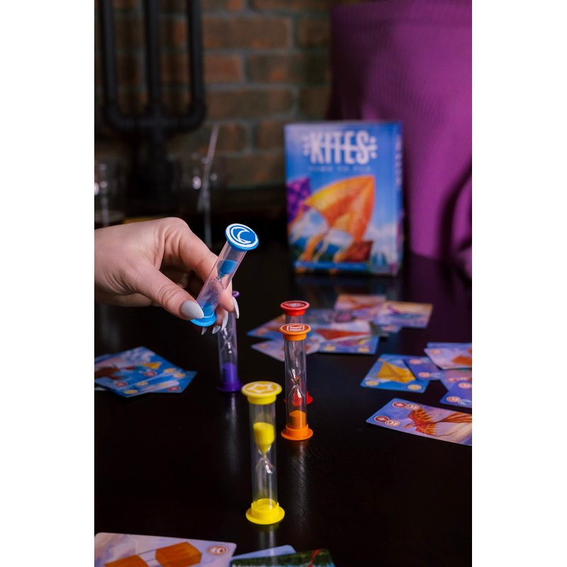 Manufacturer's Description: The sun is shining, the wind is blowing, and you know just what to do gather your friends to fly some kites In Kites, everyone works together to keep all their kites represented by colorful sand timers in the air. Take turns playing cards, flipping the sand timers, and coordinating with other players to ensure none of the timers run out. If it does, a kite has crashed Add complication cards for additional challenges. Play all of the kite cards in the deck, and everybody wins Ages: 10+