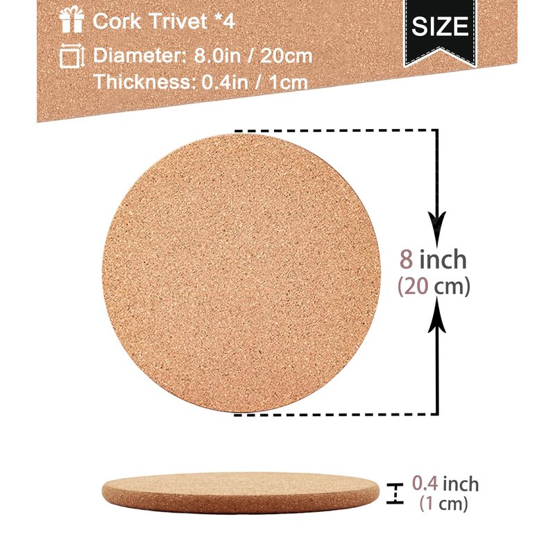 0.4 inch Thick wooden cork drink coasters, round circle cork trivets, packs of 4 Smooth edge: Their edge is processed, and the material surface is smooth. Keeps cold and hot drinks from damaging furniture, can be applied to hot pads, and cup coasters, and also can be adapted to a small plant sauce. Utility tool: The edge is processed to prevent furniture damage, and the double sides cork surface is smooth and thick so keep tabletops dry and clean, good at absorbent Specifications: Color: brown Material: wooden Size: 0.4 inches thick, 8 inches in diameter Quantity: 4 packs Shape: round Package includes: 4 x Wooden cork drink coasters