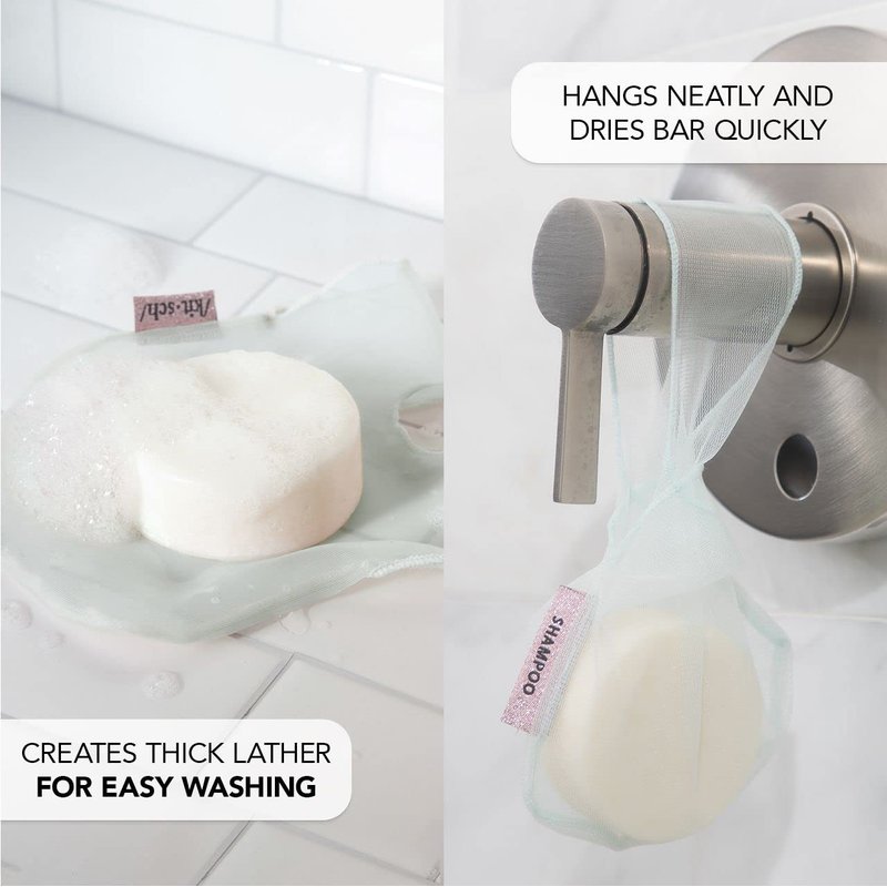 Shampoo bar bags, also known as soap bar bags, are a sustainable and convenient alternative to traditional liquid shampoo and soap bottles. These bags are specifically designed to hold solid shampoo and soap bars, such as those made by Buff City Soap. The bags are typically made of a durable and lightweight material such as mesh, which makes them easy to toss in a gym bag, purse, or suitcase for travel. The bag also has a water-resistant lining that keeps the shampoo or soap bar dry and prevents it from melting or becoming too soft. When using the shampoo or soap bar, simply wet both the bar and the bag, lather up the bar, and massage the lather into your hair or skin. The bag also can act as a exfoliating tool to the scalp and body during use. Not only do these bags, also known as soap savers, reduce the amount of plastic waste from empty shampoo and soap bottles, but they also allow for a more customizable and eco-friendly hair and body care routine. You can also find them by other names such as soap cover, soap pouch, soap saver pouch, body bag, soap holder loofah, soap bar pouch, and soap pouch for shower. Kitsch Bottle-free Beauty Bar Conditioner Bag helps create a thick foamy lather while conditioning & is the perfect pairing for our shampoo bar too. It is made of fabric that does not irritate your scalp while rubbing it. You can hang it neatly and allowing your bar shampoo bag too dry quickly.& to last longer.
