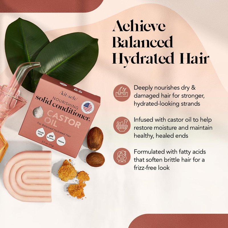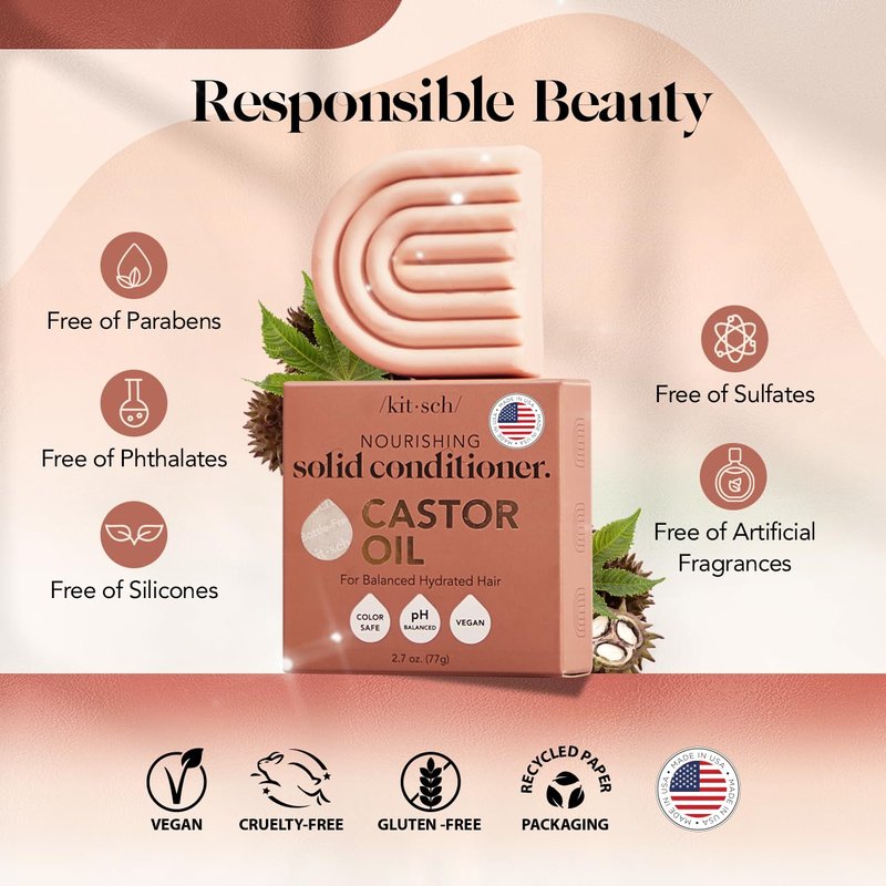 - GENTLE & SAFE FOR SENSITIVE SCALPS: Made with gentle, hypoallergenic ingredients, this Kitsch casrtor oil organic conditioner bar is suitable for sensitive scalps and skin, ensuring a pleasant, irritation-free experience. Free of parabens, phthalates, silicones, sulfates, and artificial fragrance, it’s also pH balanced and safe for color-treated hair.