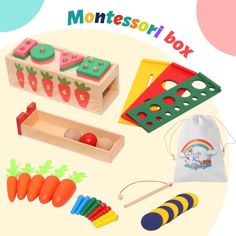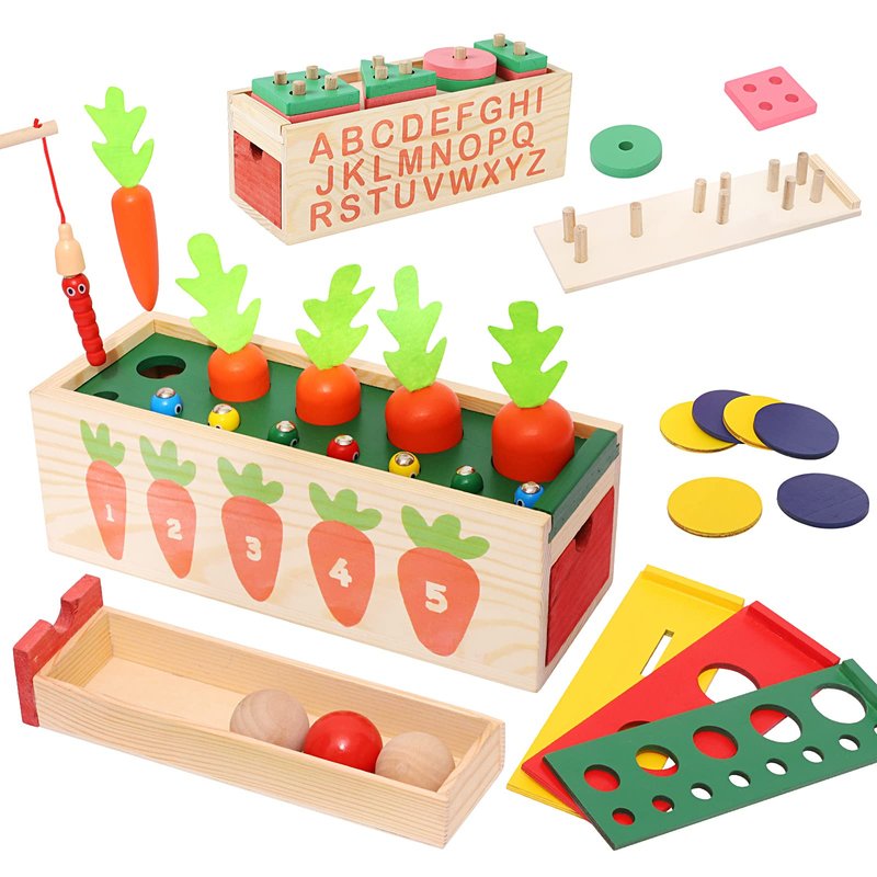 - 🥕 Colorful and Educational: Carrots, worms, coins and stacking block of various color will attract toddler's attention and immerse themselves in a fun exploration of the play. Numbers and alphabet are printed on the box, a remarkable way to inspire our kids to associate what they are playing with counting and reading.