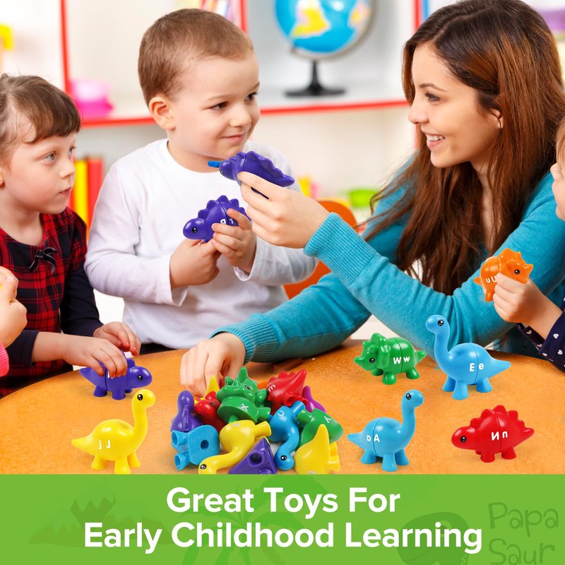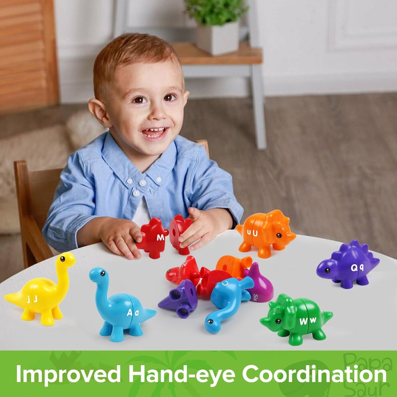 - Package includes: 13 double-sided Dinasour, and a sturdy storage box. both uppercase and lowercase letters on each side, allowing children to explore and match them. This promotes a deeper understanding of letter formation and improves their ability to recognize letters in different contexts