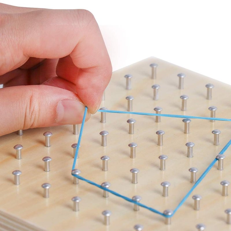 - Meterial &Size:This geoboard is an upright square lattice of 64 pcs nails, and specile umbrella-head pins keep rubber bands in place, the board measures 7 x 7 x 0.6in, weigh 0.77 Lb; Non-toxic Wood and metal ,safety standard ASTM, CPISA, EN71, CPC.