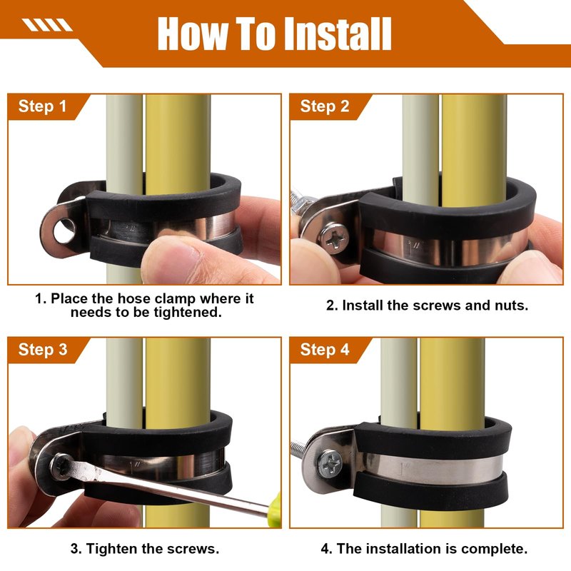 - Easy Installation: The installation is easy, just find a correct stainless steel metal cable clamp, tighten it with M6 screws. Each insulated wire clamps cushion rubber coated pipe hose clamp size is printed on the surface so that it is easy to quickly find the right size.