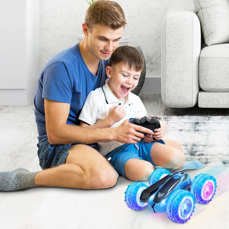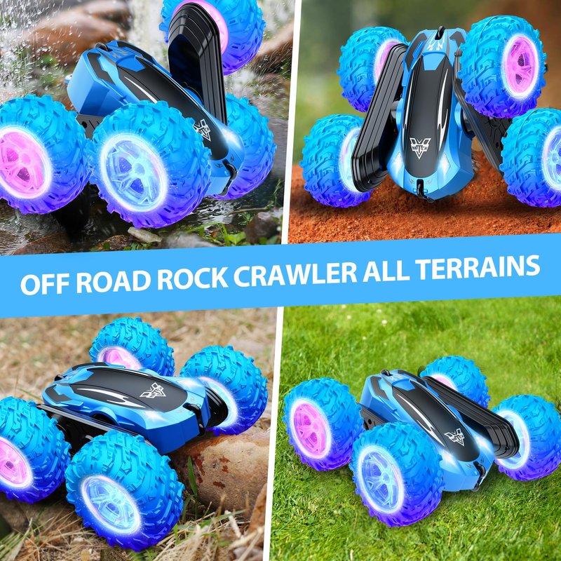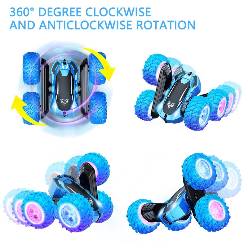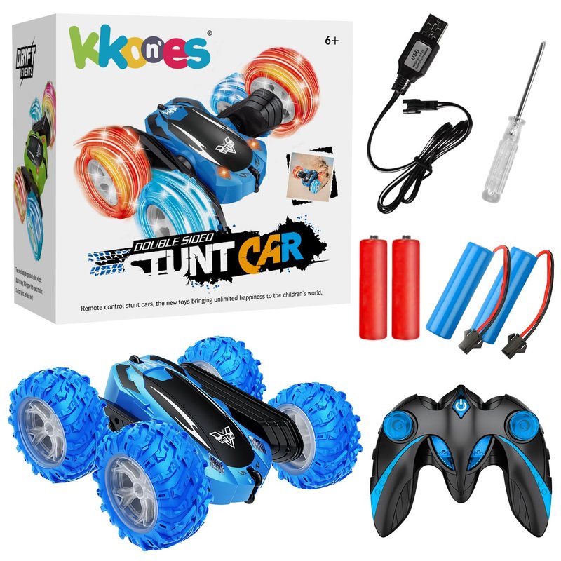 KKONES Remote Control car,2.4GHz Electric Race Stunt Car,Double Sided 360° Rolling Rotating Rotation, LED Headlights RC 4WD High Speed Off Road for 3 4 5 6 7 8-12 Year Old Boy Toys (Blue)