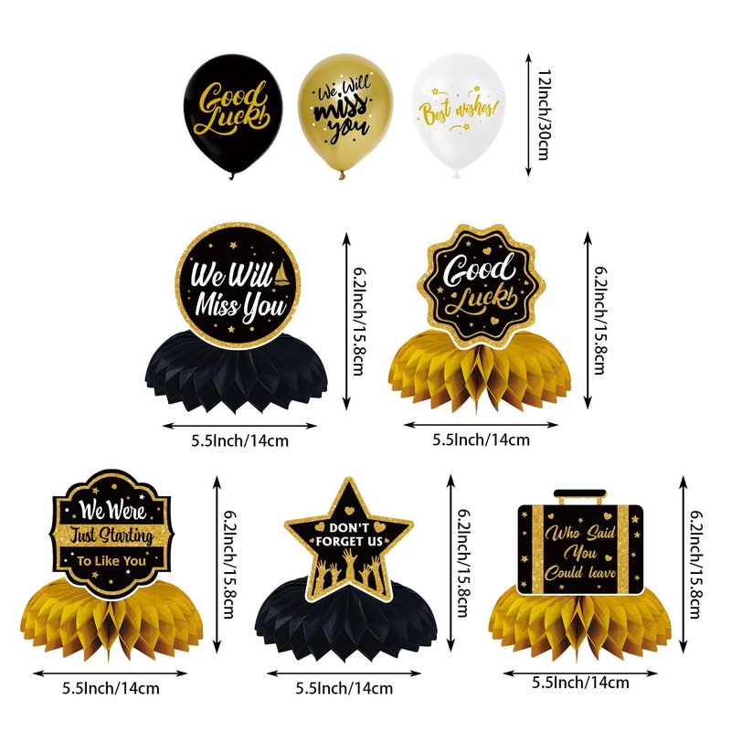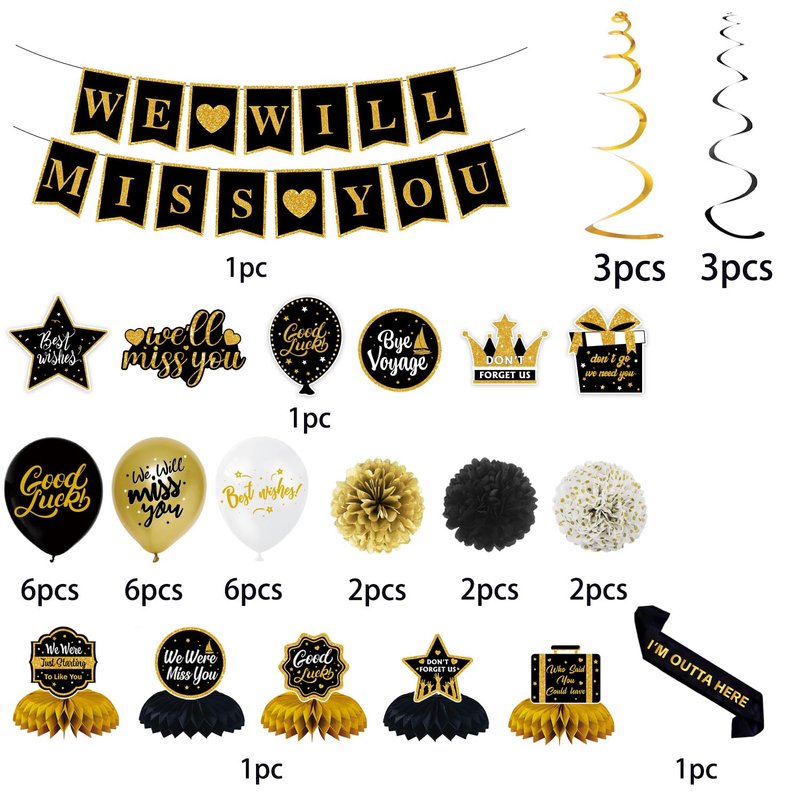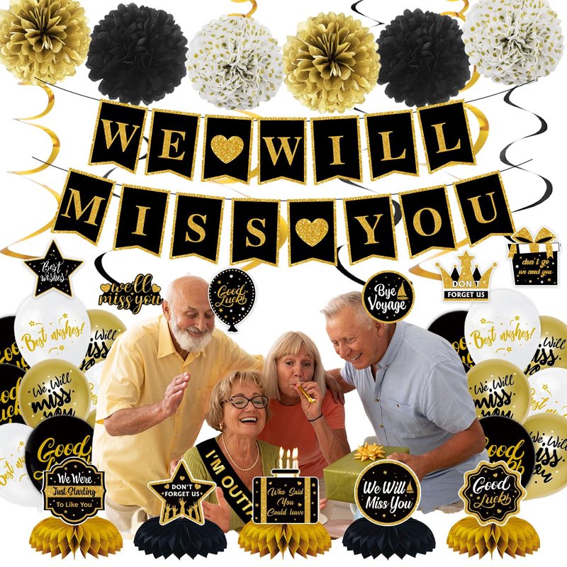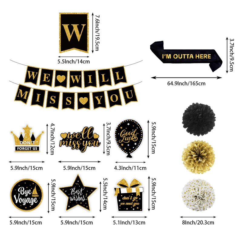 - 【PACKAGE INCLUDES】Going away party decorations includes 1pc We Will Miss You banner, 6pcs 8" paper pom poms, 6pcs hanging swirls, 5pcs honeycomb centerpieces, 18pcs balloons and 1pc sash. It allows you to create a special atmosphere and honor the retiree's achievements