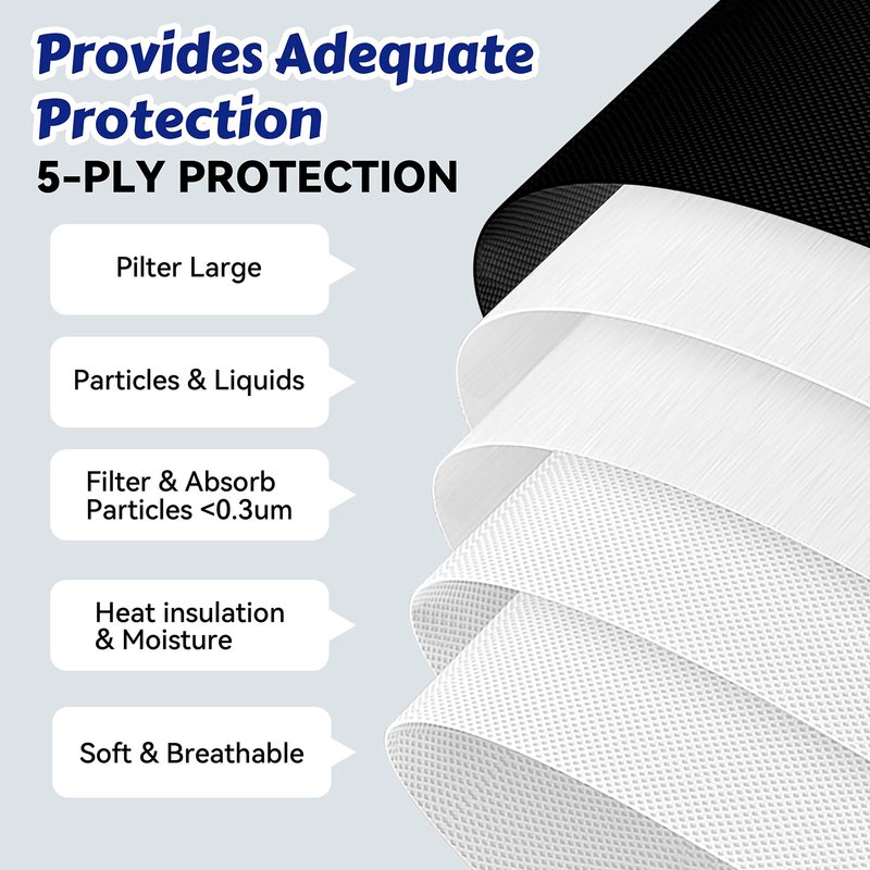 Stay protected in any situation with FACEMOON's KN95 Face Masks for adults. These black masks are not only stylish but are also designed to provide the ultimate protection. Each pack contains 100 masks, individually sealed for freshness and cleanliness. Every mask is composed of five layers of material, including two layers of non-woven fabric, two layers of melt-blown filters, and a middle layer of non-woven cotton. This combination ensures superior filtration while maintaining breathability.