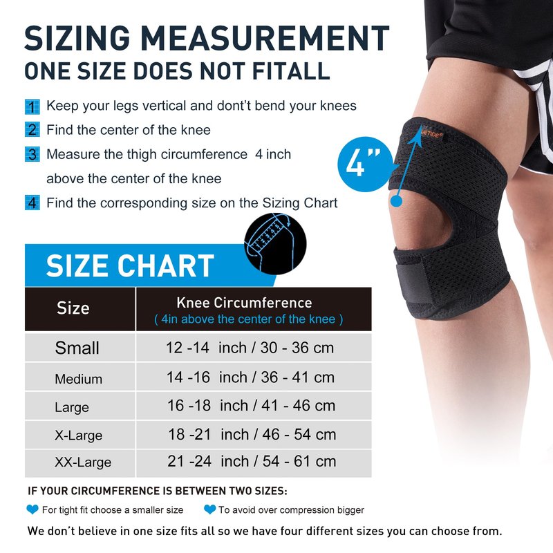 - დ ADJUSTABLE AND DURABLE: Before purchase, please measure the leg circumference 4 inches above the knee. Please check the picture in the list for the size chart. Our knee brace patella knee strap are suitable for 12-24 inches leg circumference. It can be worn on the right or left knee, directly on skin, or over leggings, pants, compressions knee sleeves.