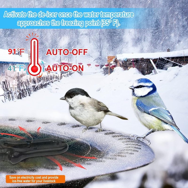 - The bird bath heater de-icer will work when temperature is below 41F, and stop to work when temperature is higher than 91℉, so de-icer will prevent water from freezing automatically.