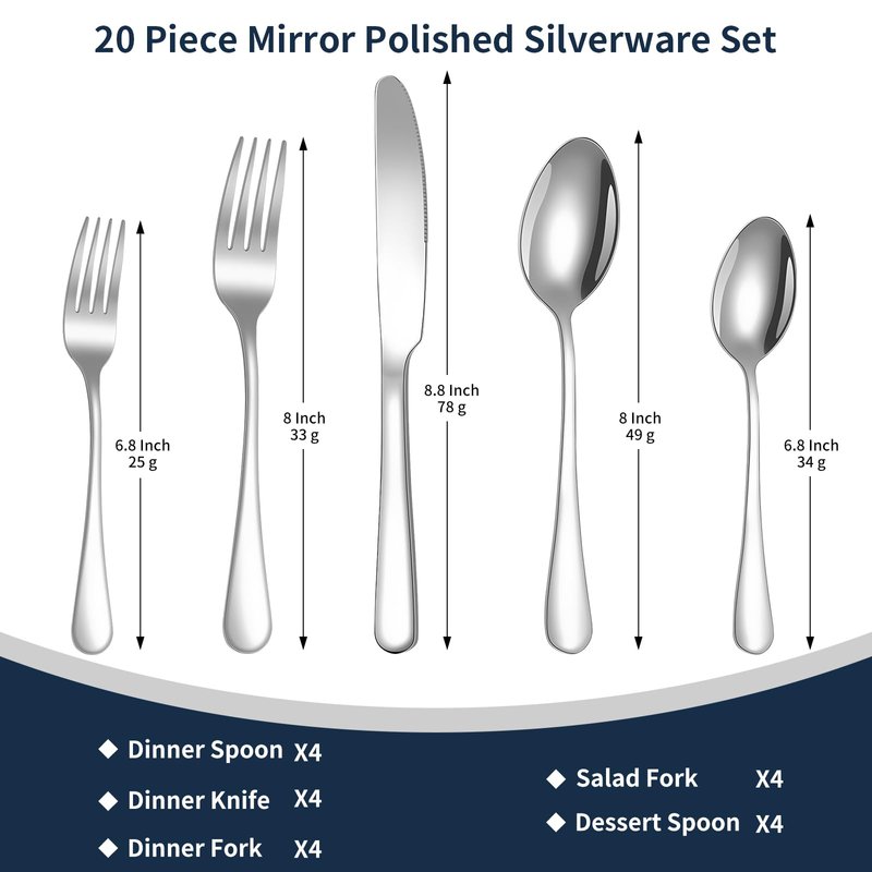 - Silverware Set for 4: Cutlery set includes 4 knives, 4 forks, 4 spoons, 4 soup spoons, and 4 salad forks,making it a comprehensive 20-piece collection tailored for family meals or entertaining 4 guests.