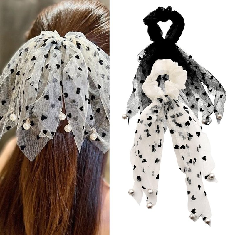 - Hair Scarf Scrunchies for Women Knotted Bow Hair Ties: Our bow hair scrunchies for girls feature a trendy and sophisticated ribbon design, the embellishments of pearls and heart add femininity and romance to your hairstyle, the color scheme of elastic hair ties for thick thin hair in black and beige is fresh and elegant, perfect for daily wear or special occasions, and 2pcs ribbon bows for hair can definitely meet your daily needs