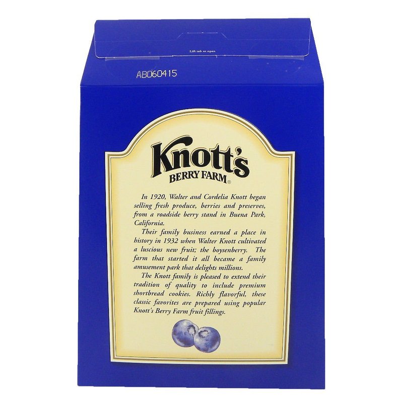 In 1920, Walter and Cordelia Knott began selling fresh produce, berries and preserves, from a roadside berry stand in Buena Park, California. Their family business earned a place in history in 1932 when Walter Knott cultivated a luscious new fruit - the boysenberry. The farm that started it all became a family amusement park that delights millions. The Knott family is pleased to extend their tradition of quality to include premium shortbread cookies. Richly flavorful, these classic favorites are prepared using popular Knott's Berry Farm fruit fillings. You will love these cookies. Allergy Information: This product is manufactured in a facility that processes milk, eggs, soy products, wheat, peanuts, pecans, almonds, walnuts, cashews, macadamia nuts & other tree nuts.