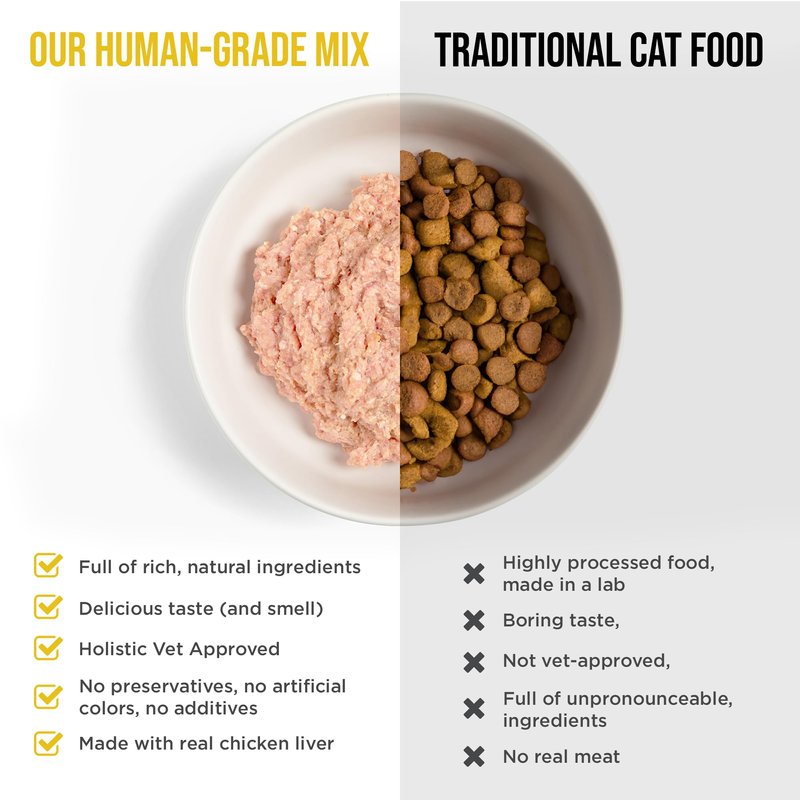 - Easy and convenient to use, just add water and RAW or COOKED meat to make your cats food. Our premix is a healthy alternative to highly processed commercial cat food.