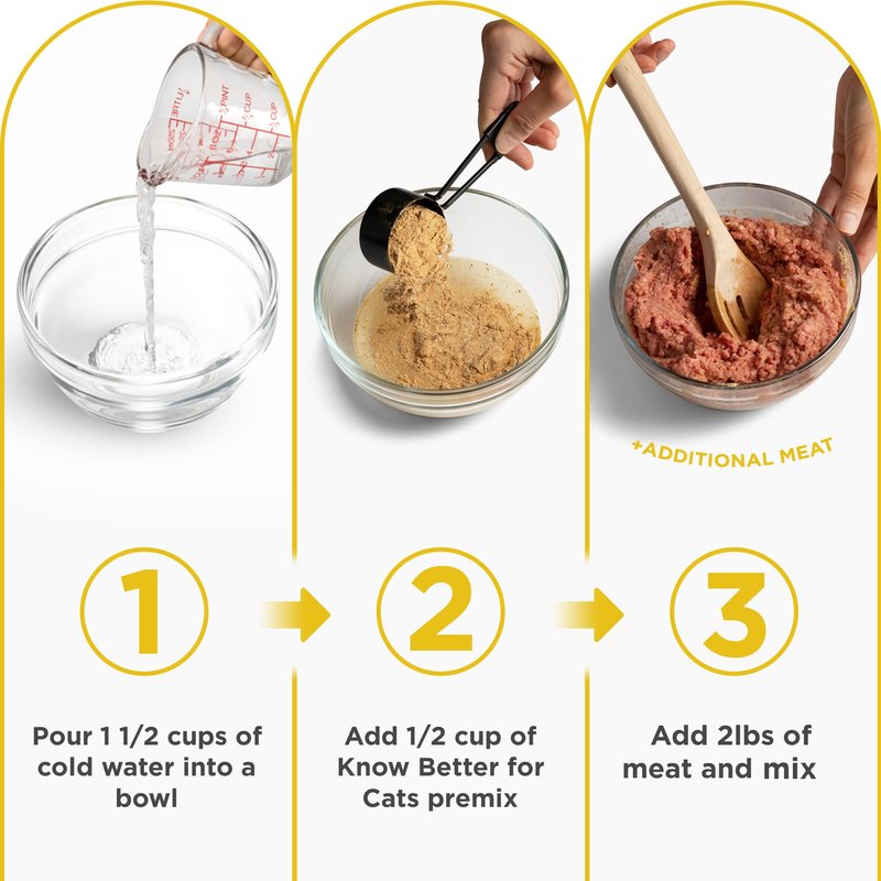 - Make a 3lb. batch of RAW or COOKED Cat Food: Recipe: 2lbs meat of your choice, 1 ½ cup water, ½ cup Know Better for Cats Premix/Supplement