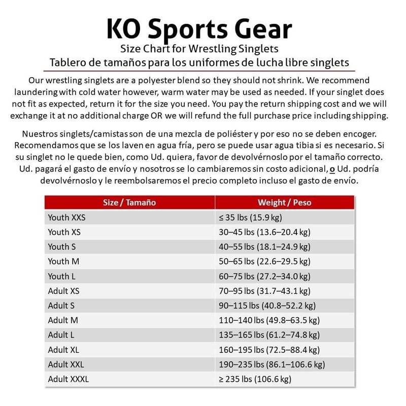 - KO Sports Gear wrestling singlets feature exclusive designs that are sublimated into the fabric which means your singlet won’t fade, crack or peel.