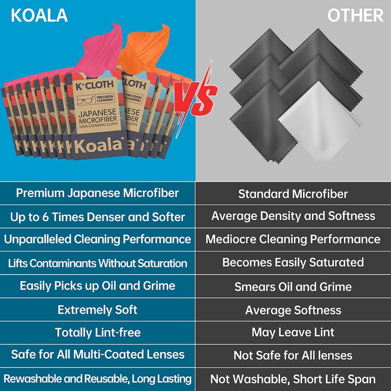 - UNPARALLELED PERFORMANCE FOR CRYSTAL-CLEAR VISION: Elevate your lens cleaning routine with Koala's microfiber cleaning cloth, meticulously crafted from an ultra-dense and super-absorbent Japanese material. It is up to 6 times denser and effortlessly absorbs toughest dirt, grime, and oils - leaving your lenses spotless.