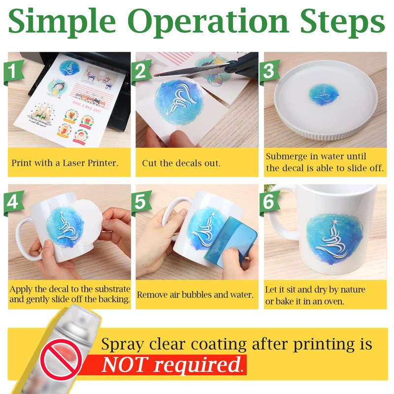 - Easier to Use: The Waterslide Decal Paper for Laser Printer does NOT need to spray coating after printing, which is much easier and saves time than using the ink jet decal paper. Tips: The clear decal paper is suitable for light or clear surfaces.