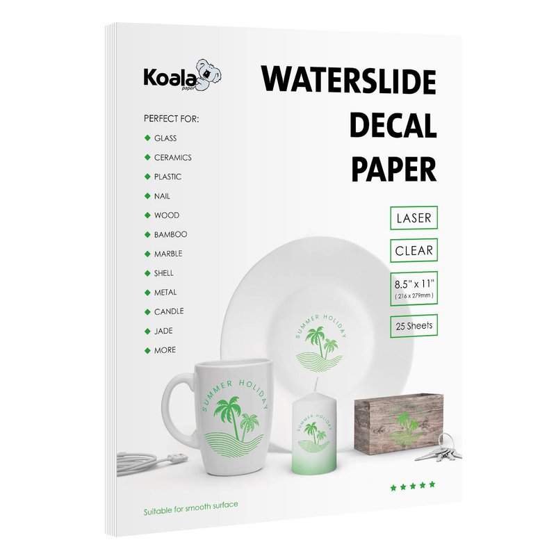 Koala Waterslide Decal Paper for Laser Printer - Clear Transparent - 25 Sheets Printable Water Slide Transfer Paper - 8.5x11 Inches