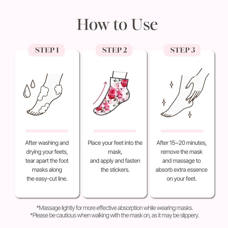 - Rose Essence Foot Mask: Experience the luxurious hydration of Koelf's Rose Petal Satin Foot Mask, enriched with rich rose souffle essence to deeply moisturize and nourish dry, rough feet.