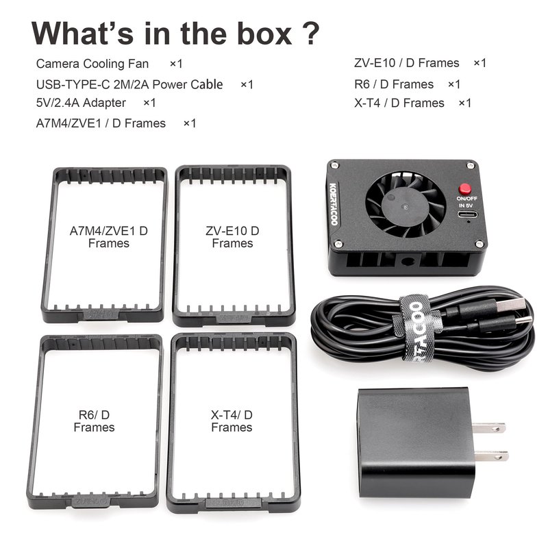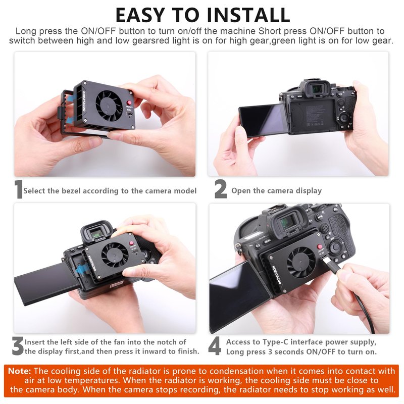 - ★ 【Precautions】During the operation of the camera cooling system, the cooling surface is prone to condensation when it comes into contact with air. Therefore, the cooling surface must be close to the camera body and do not create gaps. When the camera stops recording, the cooling fan also needs to be turned off. Package list: 1*Camera cooling fan. 1*Power cord (length 2m). 1*Power adapter. 4* Mounting buckle. 1* EVA storage box.