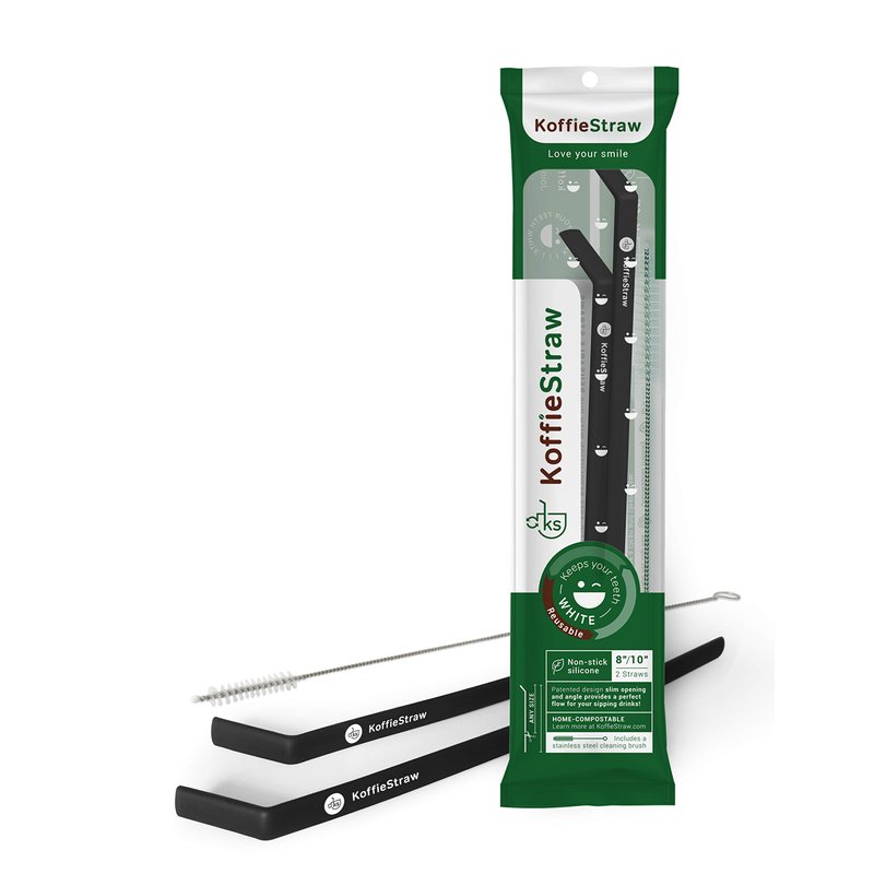 KoffieStraw Reusable Straws | 2-Pack with Stainless Steel Cleaning Brushes | Long Lasting & BPA-Free Standard Size Straws for Coffee, Tea, Milk, Cold & Hot Drink | Black - 8", 10