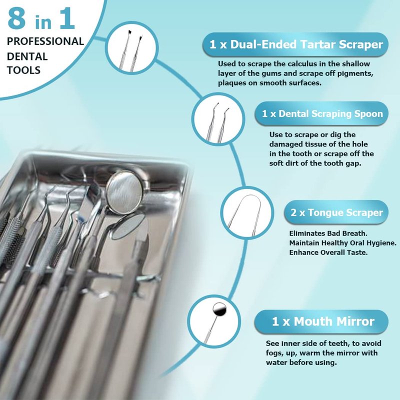 - A COMPLETE DENTAL TOOL KIT: The 8-Count dental tools set includes two type of Tongue Scraper, Tartar Scraper, Gum Cleaner, Dental Scraping Spoon, Dental Probe, Gum Cleaner, Mouth Mirror and Dental Tweezer. And the 7 shapes Teeth Cleaning Tool helps you to clean any place and remove residue and tartar easily.