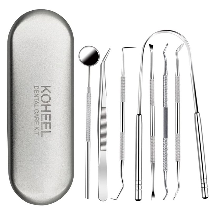 KOHEEL Dental Tools with Metal Case, 8 Count Teeth Cleaning Tools Set, Remove Plaque, Oral Care Hygiene Kit with 2 Type of Tongue Scraper, Tartar Scraper, Gum Cleaner, Dental Probe and Dental Tweezer