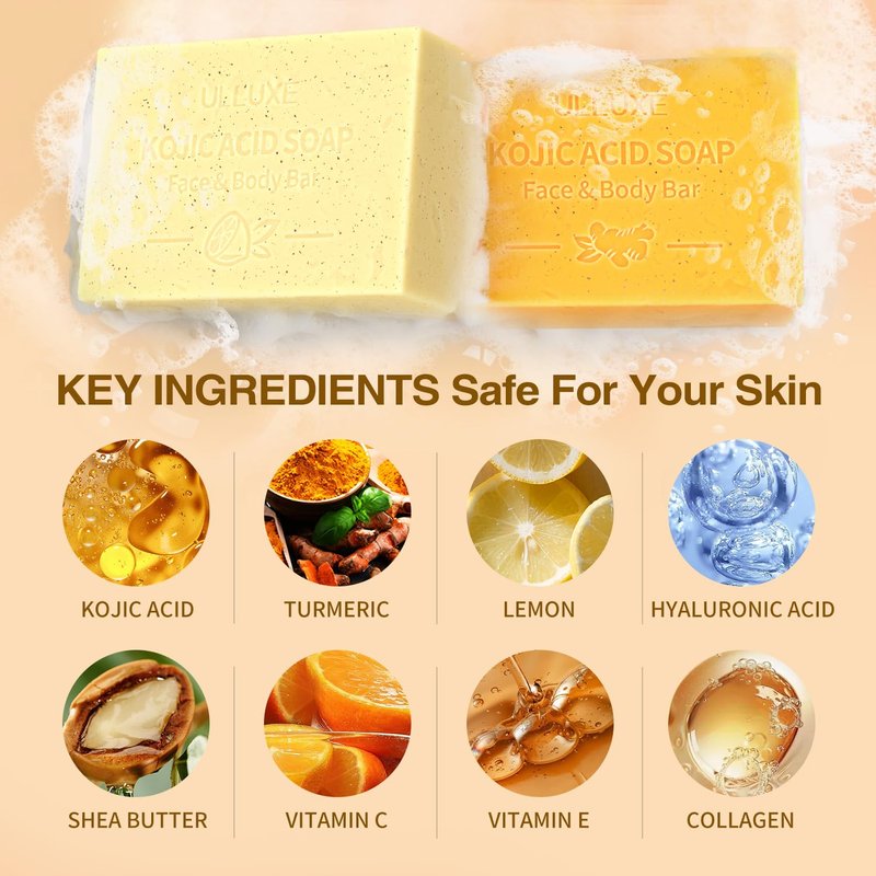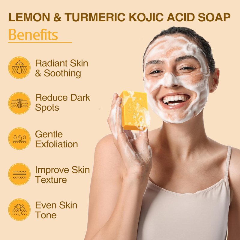 - 【Exfoliating and Revitalizing】 Turmeric kojic acid soap can remove acne-prone skin, while lemon soap bar can even out skin tone. Both soaps can effectively remove dirt, excess oil, impurities, and makeup from your skin without stripping away its natural protective oils.
