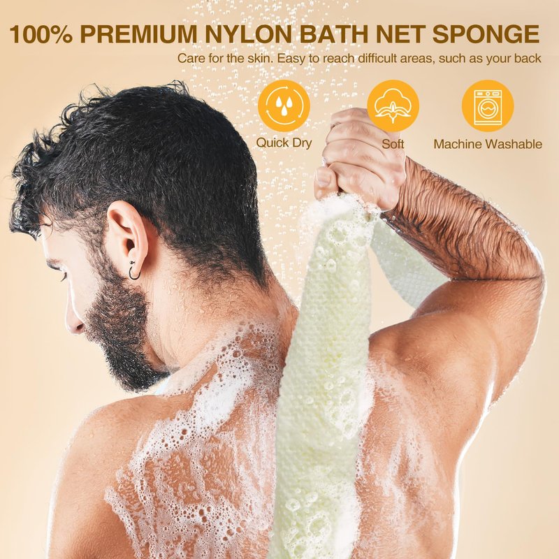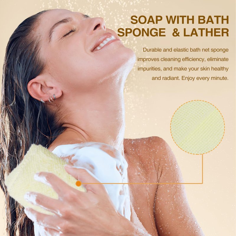 - 【Soap Bars with Bath Net Sponge】 Kojic Acid Soap Set includes a bath net sponge and a premium mesh bag to gently exfoliate, elevating your exfoliation routine for revitalized and radiant skin. The bath net sponge enhances exfoliation, removing dead skin cells and impurities, leaving your skin smooth and refreshed. Durable nylon material to ensure long life, strong soap lathering, and quick drying