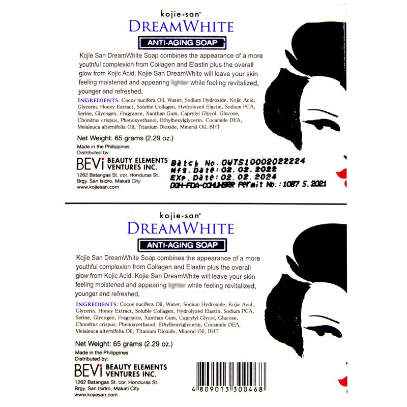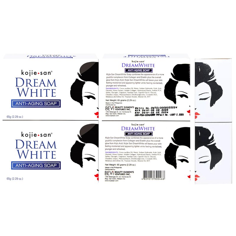 Kojie San Dream White Soap - Skin, Body, and Facial Brightening & Anti Aging Kojic Acid Soap with Collagen, Elastin & Coconut Oil - 65g x 2 Bars