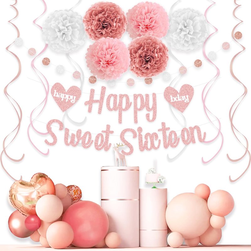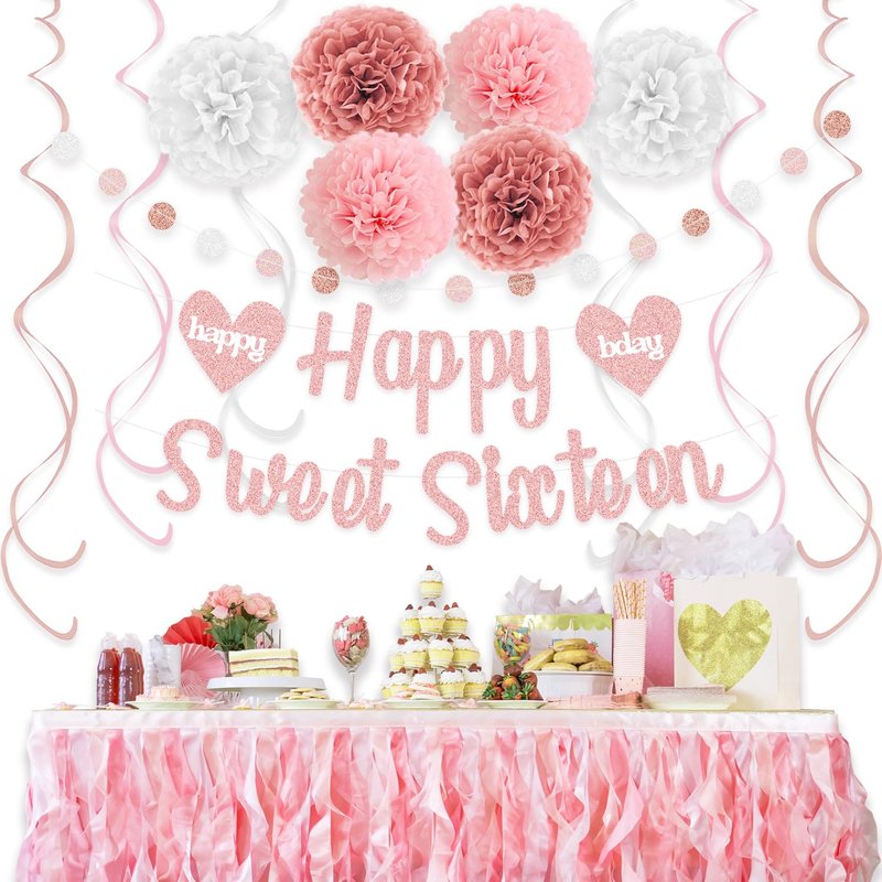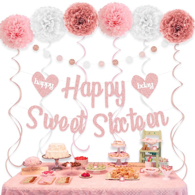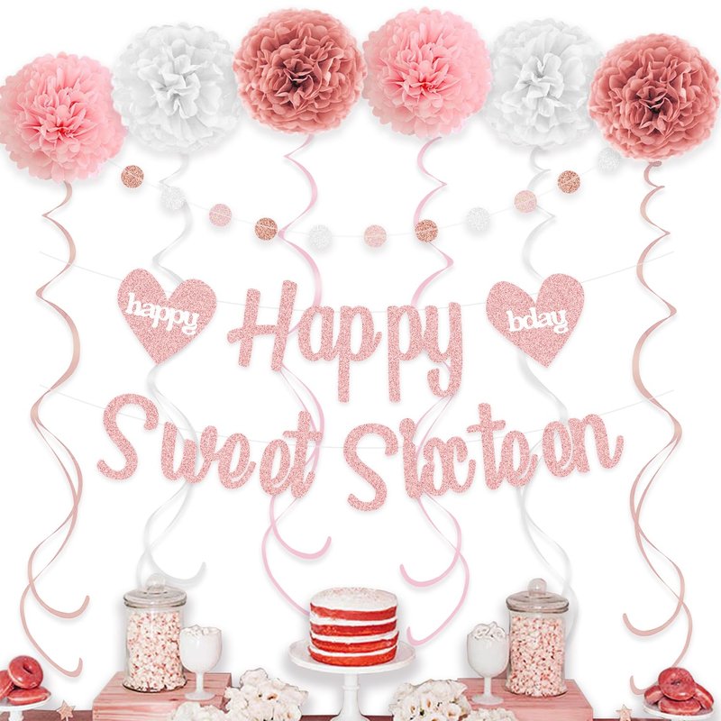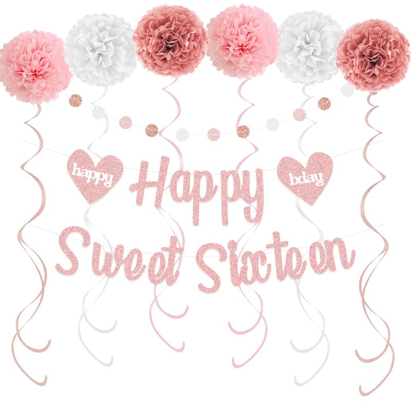 - AWESOME BIRTHDAY DECOR - Elegant 4 in 1 sweet 16 birthday decorations, 1pc happy sweet sixteen sign, 6 tissue paper pom poms (10 inch, 2 Retro Pink, 2 Pink, 2 White), 1 glittery colorful circle dots garland, 9 shiny swirls streamers (3 Rose Gold, 3 Pink, 3 White), perfect 16th birthday decorations for girls.