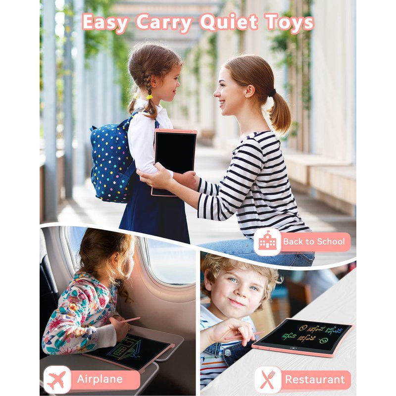 - 8.5 Inch Colorful Lcd writing Tablet: You can write on the LCD with stylus or anything else that creates pressure. As sleek as writing on paper. You can draw a very thin line and a thicker line to make things look different. With erase button on the front and lock switch. You can draw and erase easily by pressing the button on the front of the board. The pen fits snug on top of tablet and it will not come loose.