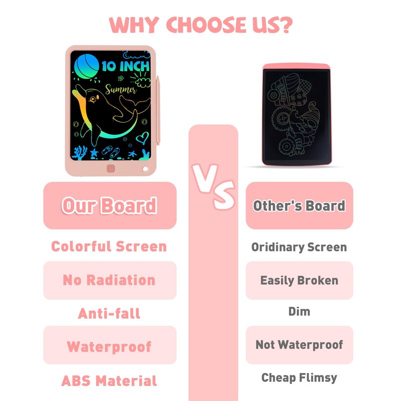 - Safe LCD Writing Tablet: This 10-inch LCD writing pad can be used for writing, drawing and doodling, perfect for children to learn and play. The edges of the kids writing board are rounded and the surface is smooth to protect young children's hands. As a writing toy, doodle toy, and toddler learning toy drawing board, it allows children to enjoy drawing, counting, spelling, writing memos and quick notes anytime and anywhere