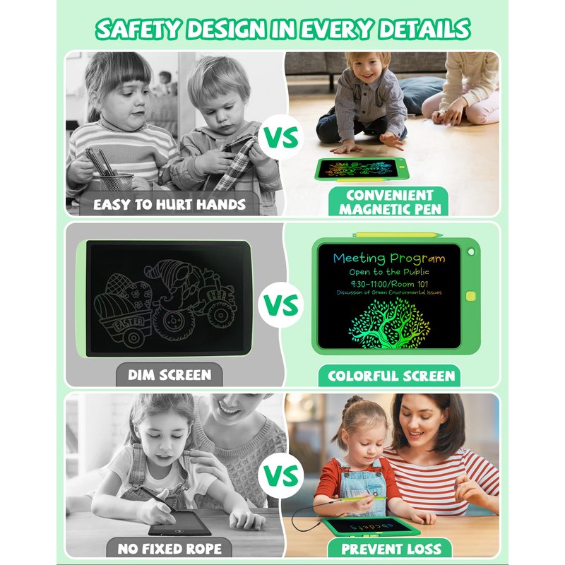 - Eye Protection & Long Battery Life: This writing board for kids colorful screen features no glare, no blue light, which is effective to protect children’s eyes for a long time use. The writing tablet can be repeated using 100,000 times, avoid paper wasting. We added a screw to the battery lock of the doodle pad to prevent children from swallowing unknown parts