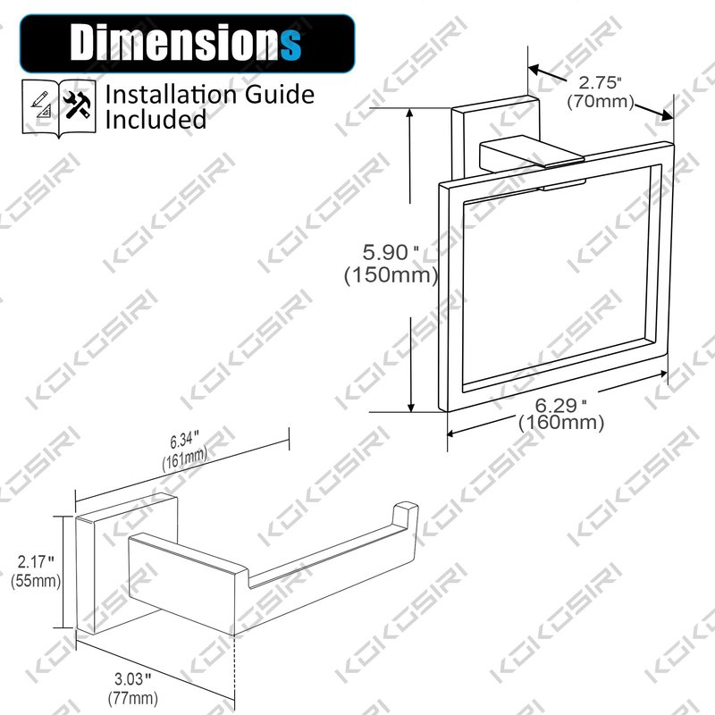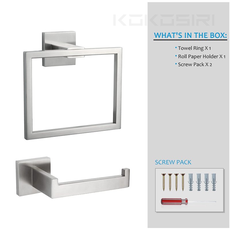- ◄ Package Content ► Toilet paper holder x 1; Towel ring x 1. All mounting hardware and instructions are included in the package. If you meet any problem during install or there is any part missing, please remember to contact with KOKOSIRI.