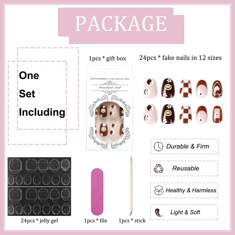 - 【Package Contents】 Our packaging box is exquisite and beautiful. It contains 24 pcs brown fake nails and 1 sheet adhesive tapes (24pcs), 1 nail file, 1 cuticle stick. There are 12 different sizes of fake nails.choose the most suitable nail according to the size of your nail cover, trim and file your nails to any length and shape as you like.