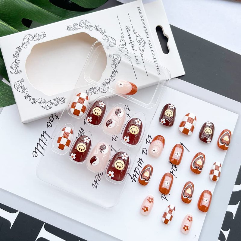 KOLONAMS Flower Press on Nails Short Almond Shape Brown Fake Nails Flowers Hearts Lattice Tai Chi Smiley Face Design Acrylic Artificail French False Nails Full Cover Glue on Nails for Women 24 Pcs