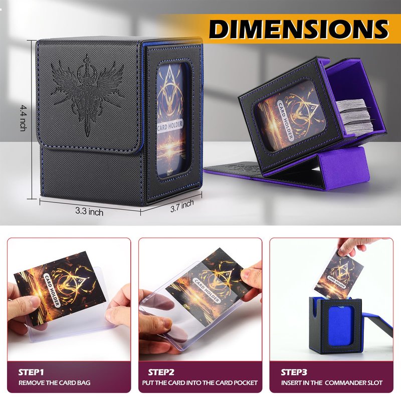 Experience the ultimate in trading card storage with our MTG Deck Box with Commander Displayâa must-have for any serious card collector or player. This deck box features a patented design with a unique Commander display window, allowing you to showcase your Commander or Prime cards effortlessly. Inspired by the iconic Legendary Emblem magic elements of MTG, the embossed logo cover design adds a touch of class and elegance to your collection. With a generous storage capacity, this deck box can hold over 100 double-sleeved cards, 120 single-sleeved cards, or 230 unsleeved cards, making it the perfect companion for your card battles. The wide U-shaped opening and flip-cover design ensure that you can easily access your cards during gameplay, providing a seamless experience every time. Protection is paramount, and this deck box delivers with its denim-textured PU leather exterior, offering a durable, shock-proof shell that keeps your cards safe from damage. Inside, the soft microfiber lining prevents scratches, ensuring that your cards remain in mint condition. The strong magnetic closure, secured by 4 powerful magnets, ensures that the box stays closed during transport, so you can carry your cards with confidence. Effortless organization is at your fingertips with the included 2 card dividers, a toploader for your most prized cards. This deck box is not just for MTG players; its versatile design makes it compatible with various trading card games, including Yugioh!, Duel Masters, and even sports cards. Whether youâre a seasoned collector or just starting, this deck box is a perfect blend of functionality, style, and protection. Keep your cards organized, protected, and ready for battle with this premium MTG Deck Box with Commander Display. Your trading cards are valuable, and they deserve the best protection. Our deck box features an innovative card supporter, specifically designed to keep your cards upright and prevent bending or damage, even when the box isnât fully loaded. This ensures your collection remains in pristine condition, preserving the value and integrity of every card. Say goodbye to the frustration of sifting through disorganized cards. With 10 vibrant, colorful dividers included, this deck box makes it easy to categorize and organize your cards and accessories. Quickly identify and retrieve the exact cards you need, saving time during gameplay and making your collection easier to manage. Whether youâre a fan of Magic: The Gathering, PokĂ©mon, YuGiOh!, or sports cards, this versatile deck box is designed to accommodate a wide range of trading card games. Itâs also perfect for storing Dominion cards, expansions, and other collectibles, making it a must-have for any card enthusiast. Crafted from durable PU leather, our deck box offers exceptional wear resistance and protection far superior to plastic or cardboard alternatives. The exterior is designed to withstand the rigors of travel and daily use, while the soft microfiber interior gently cradles your cards, safeguarding them against scratches. The multiple strong magnets embedded in the lid ensure a secure closure, so you can confidently transport your collection wherever your game takes you. Looking for a thoughtful gift for the card collector in your life? This deck box combines style, functionality, and durability, making it the ideal present for any trading card enthusiast. Its sleek design not only enhances the appearance of any collection but also keeps gaming spaces neat and tidy. Invest in the best with our Premium TCG Deck Boxâa sophisticated and practical solution for all your trading card storage needs. Whether youâre organizing your collection, heading to a tournament, or simply looking to upgrade your storage game, this deck box is the perfect companion for your journey. Your trading cards are valuable, and they deserve the best protection. Our deck box features an innovative card supporter, specifically designed to keep your cards upright and prevent bending or damage, even when the box isnât fully loaded. This ensures your collection remains in pristine condition, preserving the value and integrity of every card. Say goodbye to the frustration of sifting through disorganized cards. With 10 vibrant, colorful dividers included, this deck box makes it easy to categorize and organize your cards and accessories. Quickly identify and retrieve the exact cards you need, saving time during gameplay and making your collection easier to manage. Whether youâre a fan of Magic: The Gathering, PokĂ©mon, YuGiOh!, or sports cards, this versatile deck box is designed to accommodate a wide range of trading card games. Itâs also perfect for storing Dominion cards, expansions, and other collectibles, making it a must-have for any card enthusiast. Crafted from durable PU leather, our deck box offers exceptional wear resistance and protection far superior to plastic or cardboard alternatives. The exterior is designed to withstand the rigors of travel and daily use, while the soft microfiber interior gently cradles your cards, safeguarding them against scratches. The multiple strong magnets embedded in the lid ensure a secure closure, so you can confidently transport your collection wherever your game takes you. Looking for a thoughtful gift for the card collector in your life? This deck box combines style, functionality, and durability, making it the ideal present for any trading card enthusiast. Its sleek design not only enhances the appearance of any collection but also keeps gaming spaces neat and tidy. Invest in the best with our Premium TCG Deck Boxâa sophisticated and practical solution for all your trading card storage needs. Whether youâre organizing your collection, heading to a tournament, or simply looking to upgrade your storage game, this deck box is the perfect companion for your journey.