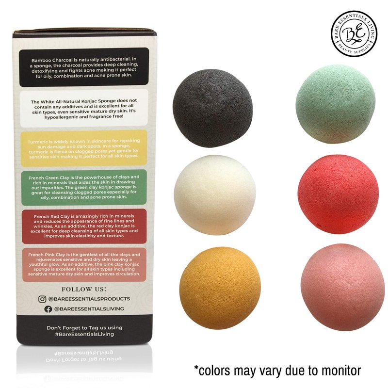 - IN THE BOX: Konjac Sponge 12 Pack Bulk Set. 2 Konjac Sponges Infused with Activated Charcoal and 2 Variety Konjac Sponges- 2 Each Plain, Turmeric, Green Clay, Rose/Pink Clay and Red Clay.