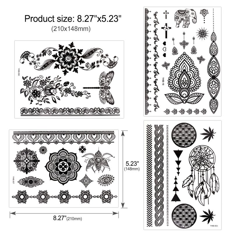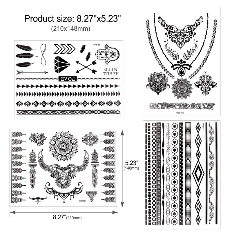 - 10 Sheets Henna tattoo Sticker - Our festival temporary tattoos Over 70 stunning designs, Includes feathers, necklaces, bracelets, flowers, butterfly, arrows, wings etc, You can experiment with different designs and combinations, to find the perfect tattoo for you.