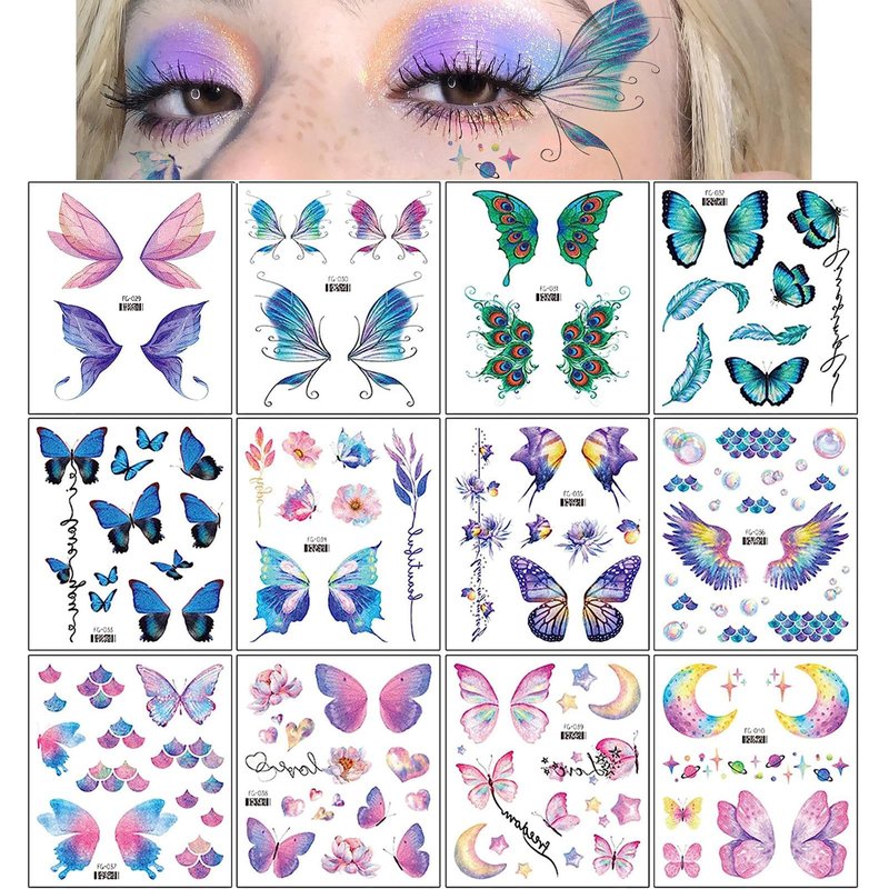- Glitter Butterfly Temporary Tattoo: Package includes 12 sheets (100pcs) Glitter Face Sticker Set for Women And Girls. Different pattern designs are suitable for different eye makeup. There are enough quantities and various charming styles to meet your different decoration ideals